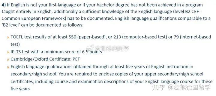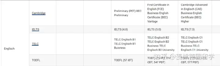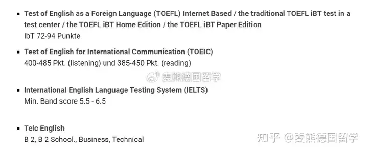 目前,雅思和托福是认可度最高的两种英语语言考试。多数德国大学的英语授课专业需要雅思6.5或雅思7.0的英语成绩,比如慕尼黑工业大学、斯图加特大学,对于有些同学来说取得这个成绩还是比较困难。