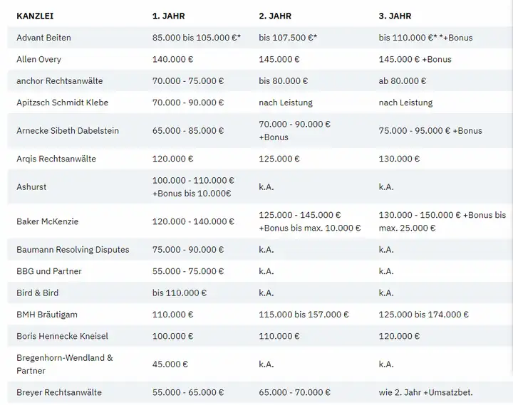 以下是德国律师行业顶级雇主所能给到的起薪情况,我们来简单了解一下: