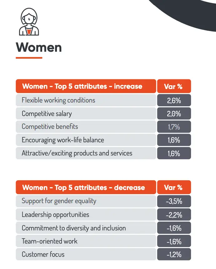虽然学生们在选择未来雇主时,会做出权衡(表示这些因素是可替代的),愿意在生活质量因素上妥协。但是对于工作灵活性和生活工作平衡仍然是满意度和保留率的关键驱动因素,特别是对于女性来说,她们会更有可能优先考虑这个问题。这一点在男性与女性对雇主的吸引力驱动因素调查中可以显现。