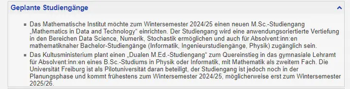 弗莱堡大学是这一试点项目的一部分,但该学位课程仍在规划阶段,最早可能在2024/25年冬季学期开始,也有可能要等到2025/26年冬季学期才会正式推出。