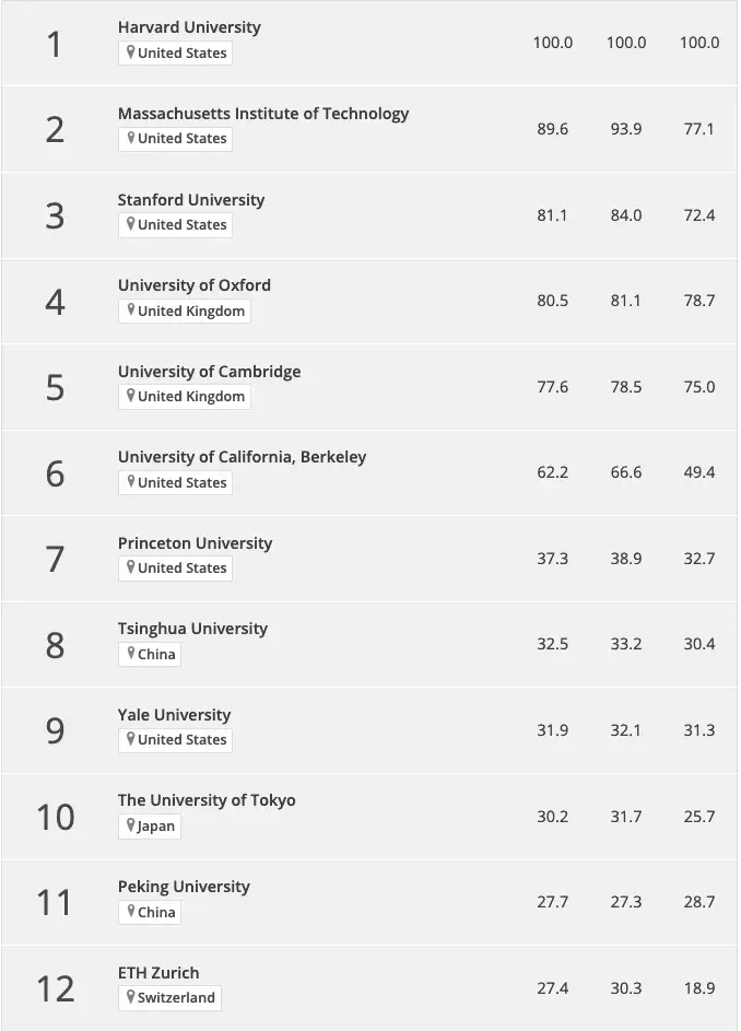 北京大学以3分之差落后于东京大学,位列全球大学声誉排行榜第十一位,以0.3分的优势力压ETH(苏黎世联邦理工)。