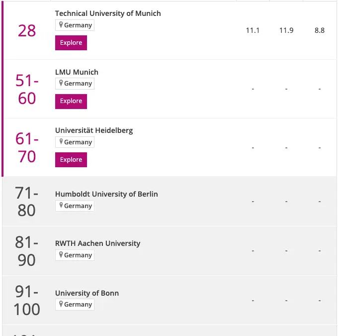 根据泰晤士高等教育排行榜,最知名的德国大学是慕尼黑工业大学 (TUM),排名第 28 位,其次是慕尼黑大学 (LMU,第 51-60 位) 和海德堡大学 (61-70 位)。