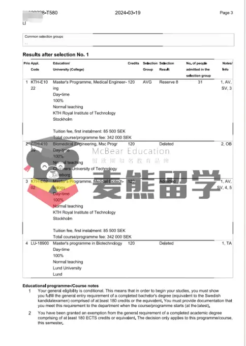 1.李同学, 西南交通大学, 211,非985, 生物医学工程, 均分84.14/100, 雅思6.5, 没有GMAT/GRE。KTH Master Biomedical Engineering录取