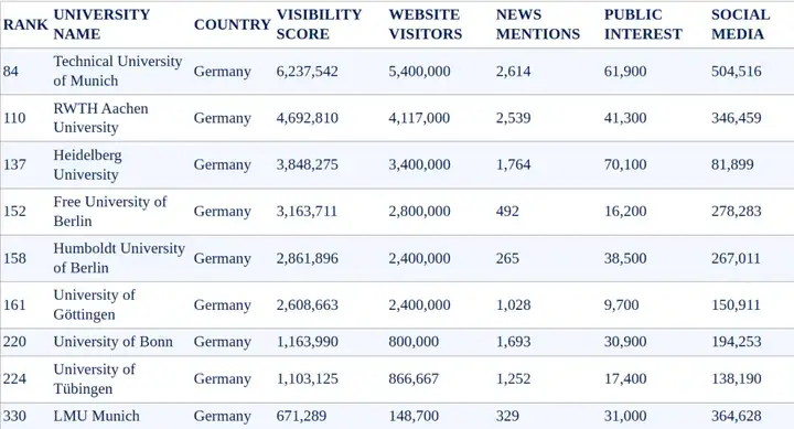 此外,不同国家的教育体系和文化背景存在差异,这也可能影响德国高校在国际上获得高流量的关注度。而德语并未像英语一样普及可能也是原因之一。