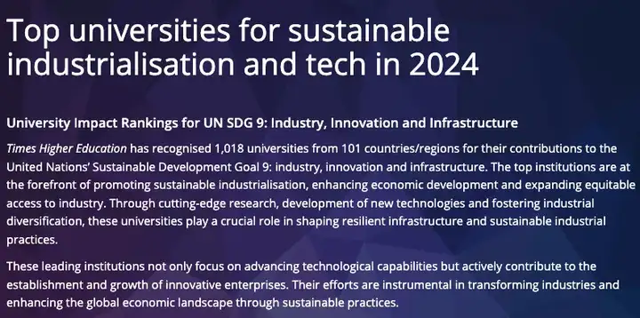 根据泰晤士高等教育官方的解释,他们统计了来自 101 个国家/地区的 1,018 所大学对联合国可持续发展目标 9(工业、创新和基础设施)的贡献。这些顶尖机构在推动可持续工业化、促进经济发展和扩大公平工业准入方面处于领先地位。通过尖端研究、新技术开发和促进工业多元化,这些大学在塑造弹性基础设施和可持续工业实践方面发挥着至关重要的作用。