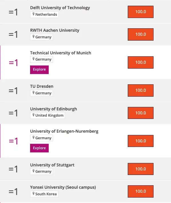 这个排名中,共有8所高校并列世界第一,其中5所来自德国,分别是亚琛工大,慕尼黑工大,德累斯顿工大,纽伦堡大学和斯图加特大学,另外三个是荷兰的代尔夫特理工大学,英国的爱丁堡大学以及韩国的延世大学。