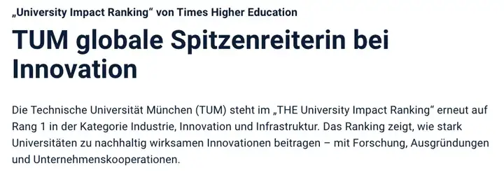 慕尼黑工业大学(TUM)再次在“THE大学影响力排名”中的“工业、创新和基础设施”类别中排名世界第一。该排名显示了大学通过研究、衍生产品和企业合作对可持续有效创新的贡献有多大。