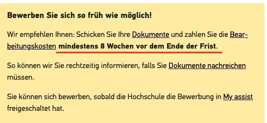 这里特别提示一下。有些同学在通过UA申请时有个误区,会以为在uni assist上申请一定要比大学的申请截止日期早上几个礼拜。他们认为需要UA在申请截止之前把材料转交给德国大学。